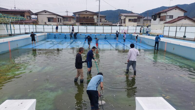 おやじの会のお父さんたちが、休日に学校のプール清掃をボランティアで実施!