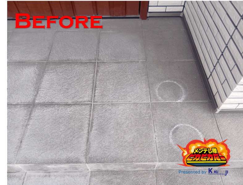施工前の写真では、タイル全体がくすんで白っぽくなっていたり、丸い輪ジミが目立っていました。